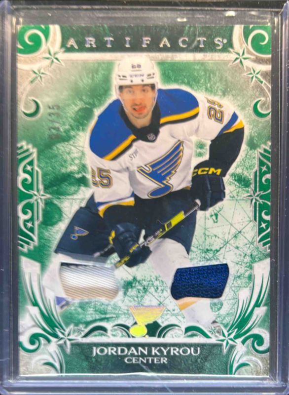 The Jordan Kyrou 2024 Upper Deck Artifacts #134 Material - Emerald /35 card is 1 of 26 Jordan Kyrou's card variations in the 2024 Upper Deck Artifacts set being tracked by Sports Card Investor, including Foilboard, Foilboard Gold, Neon Green, Plexi, and Silver /699.