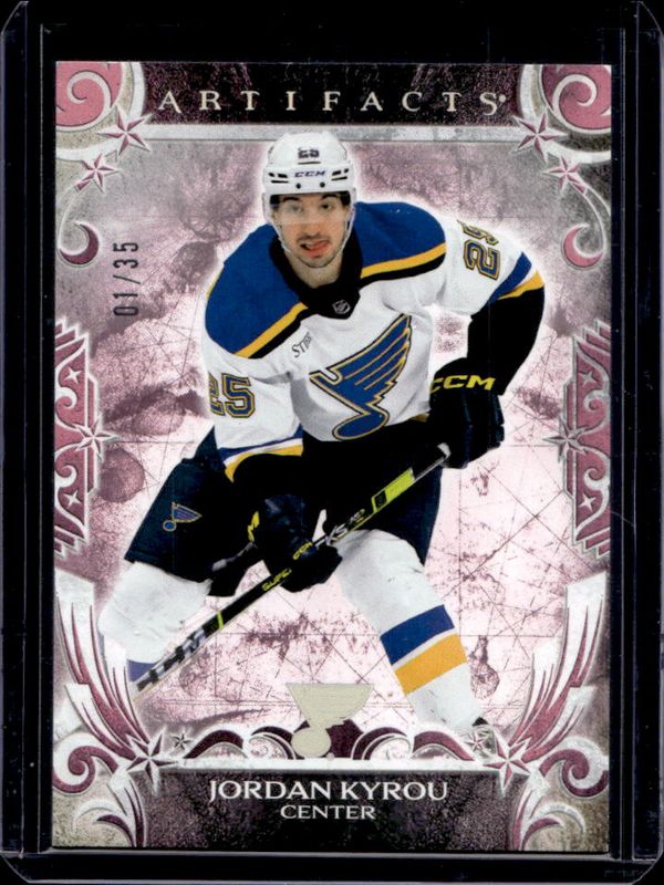 The Jordan Kyrou 2024 Upper Deck Artifacts #134 Pink /35 card is 1 of 26 Jordan Kyrou's card variations in the 2024 Upper Deck Artifacts set being tracked by Sports Card Investor, including Foilboard, Foilboard Gold, Neon Green, Plexi, and Silver /699.
