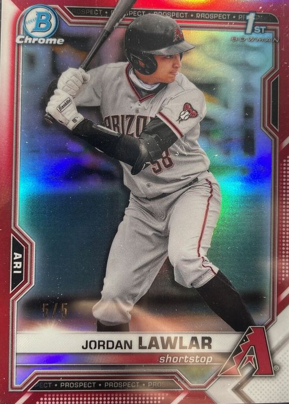 The Jordan Lawlar 2021 Bowman Draft #BDC-194 Chrome - Red Refractor /5 (1st) card in Raw condition has not changed in price in the last 30 days and was last sold for $3,251.00 .