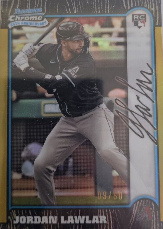 The Jordan Lawlar 2024 Bowman Chrome #BC25-6 1999 Bowman Chrome 25th Anniversary - Gold Refractor /50 Rookie card in Raw condition has moved up $4.25 (+131%) in the last 30 days and was last sold for $7.50 .