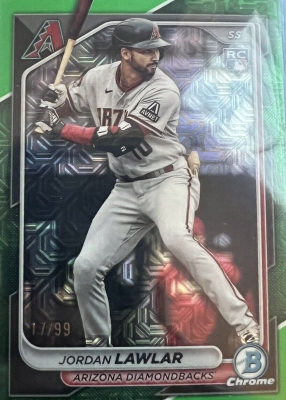 The Jordan Lawlar 2024 Bowman Chrome Mega Box #55 Green Mojo Refractor /99 Rookie card in Raw condition has not changed in price in the last 30 days and was last sold for $10.50 .
