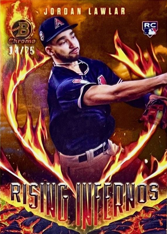 The Jordan Lawlar 2024 Bowman #RI-3 Rising Infernos - Orange Refractor /25 Rookie card in Raw condition has not changed in price in the last 30 days and was last sold for $20.50 .