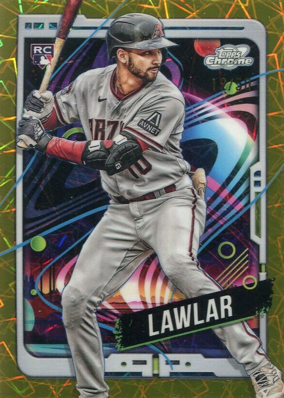 The Jordan Lawlar 2024 Topps Chrome Cosmic #5 Gold Interstellar Refractor /50 Rookie card in Raw condition has not changed in price in the last 30 days and was last sold for $23.95 .