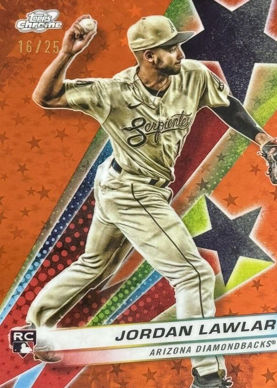 The Jordan Lawlar 2024 Topps Chrome Cosmic #SF-12 Starfractor - Orange Galactic Refractor /25 Rookie card in Raw condition has not changed in price in the last 30 days and was last sold for $37.49 .