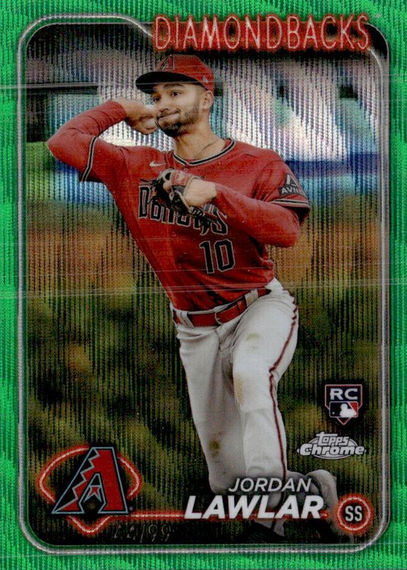 The Jordan Lawlar 2024 Topps Chrome #229 Green Wave Refractor /99 Rookie card in Raw condition has not changed in price in the last 30 days and was last sold for $6.51 .