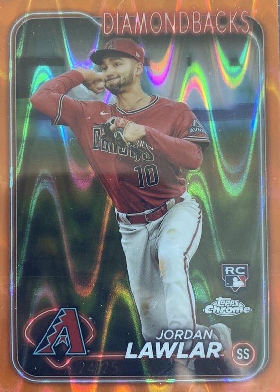 The Jordan Lawlar 2024 Topps Chrome #229 Orange Wave Refractor /25 Rookie card in Raw condition has not changed in price in the last 30 days and was last sold for $30.00 .