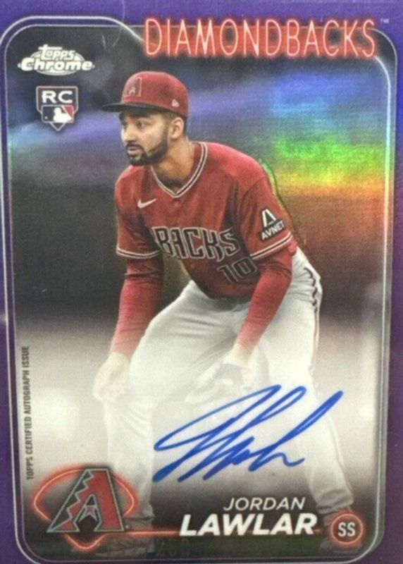 The Jordan Lawlar 2024 Topps Chrome #RA-JLA Rookie Autographs - Purple Refractor /250 card in Raw condition has not changed in price in the last 30 days and was last sold for $26.00 .