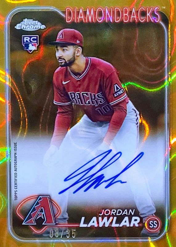 The Jordan Lawlar 2024 Topps Chrome Update #RA-JLA Autographs - Gold & Orange Lava Lamp Refractor /35 Rookie card in Raw condition has not changed in price in the last 30 days and was last sold for $225.00 .