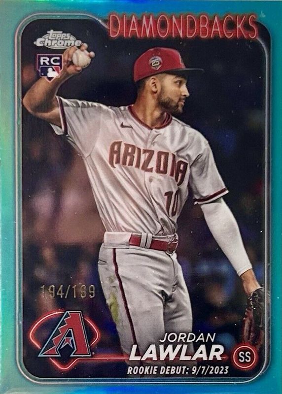 The Jordan Lawlar 2024 Topps Chrome Update #USC51 Rookie Debut - Aqua Refractor /199 card in Raw condition has not changed in price in the last 30 days and was last sold for $7.99 .