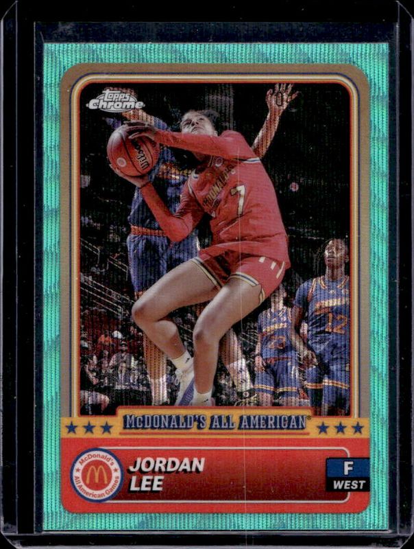 The Jordan Lee 2024 Topps Chrome McDonald's All-American #18 Aqua Wave Refractor /199 card is 1 of 112 Jordan Lee's card variations in the 2024 Topps Chrome McDonald's All-American set being tracked by Sports Card Investor, including #68 Base, #18 Base, #18 Blue RayWave Refractor, #68 Blue RayWave Refractor, and #18 McDonald's Logo Refractor.