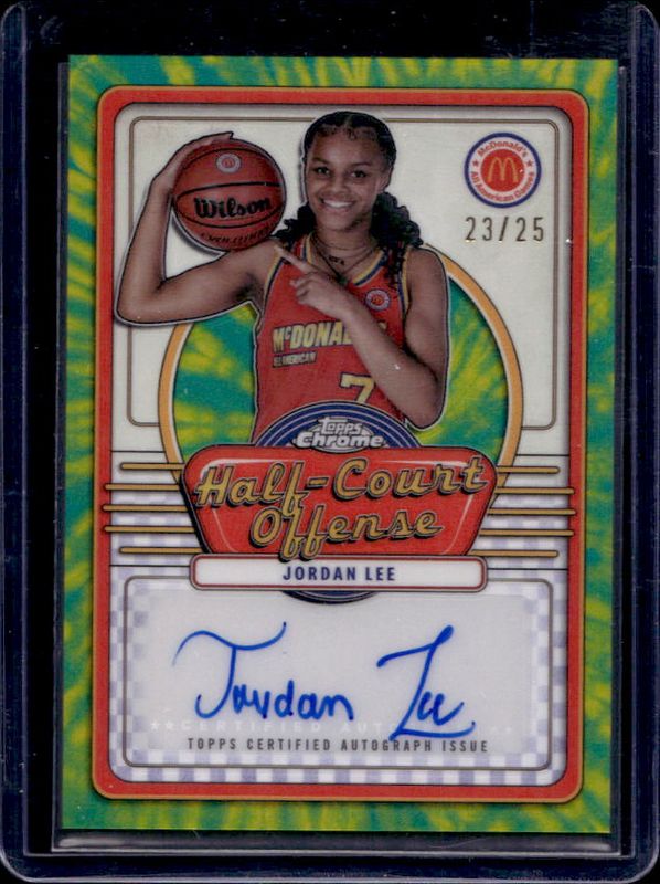 The Jordan Lee 2024 Topps Chrome McDonald's All-American #IML-JOR Half-Court Signatures - Tie-Dye Refractor /25 card is 1 of 112 Jordan Lee's card variations in the 2024 Topps Chrome McDonald's All-American set being tracked by Sports Card Investor, including #68 Base, #18 Base, #18 Blue RayWave Refractor, #68 Blue RayWave Refractor, and #18 McDonald's Logo Refractor.