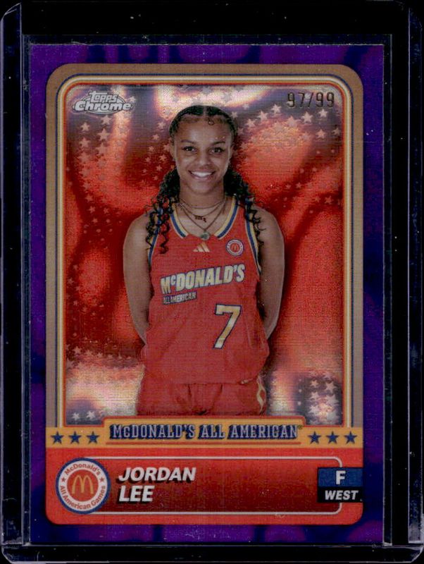 The Jordan Lee 2024 Topps Chrome McDonald's All-American #68 Purple Lava Refractor /99 card is 1 of 112 Jordan Lee's card variations in the 2024 Topps Chrome McDonald's All-American set being tracked by Sports Card Investor, including #68 Base, #18 Base, #18 Blue RayWave Refractor, #68 Blue RayWave Refractor, and #18 McDonald's Logo Refractor.
