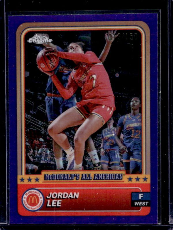 The Jordan Lee 2024 Topps Chrome McDonald's All-American #18 Purple Refractor /150 card is 1 of 112 Jordan Lee's card variations in the 2024 Topps Chrome McDonald's All-American set being tracked by Sports Card Investor, including #68 Base, #18 Base, #18 Blue RayWave Refractor, #68 Blue RayWave Refractor, and #18 McDonald's Logo Refractor.