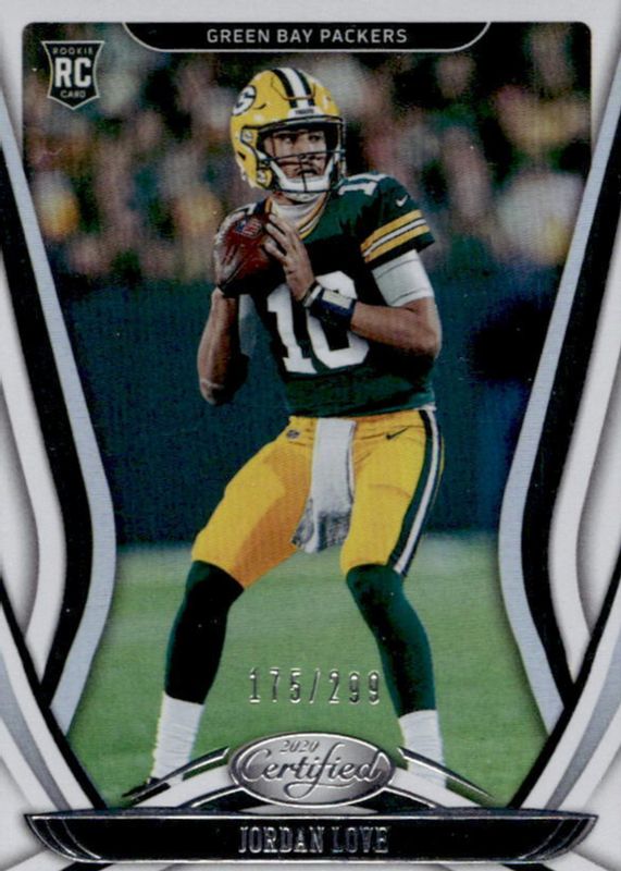 The Jordan Love 2020 Certified #104 Mirror (Rookie) /299 card in Raw condition has not changed in price in the last 30 days and was last sold for $12.50 .