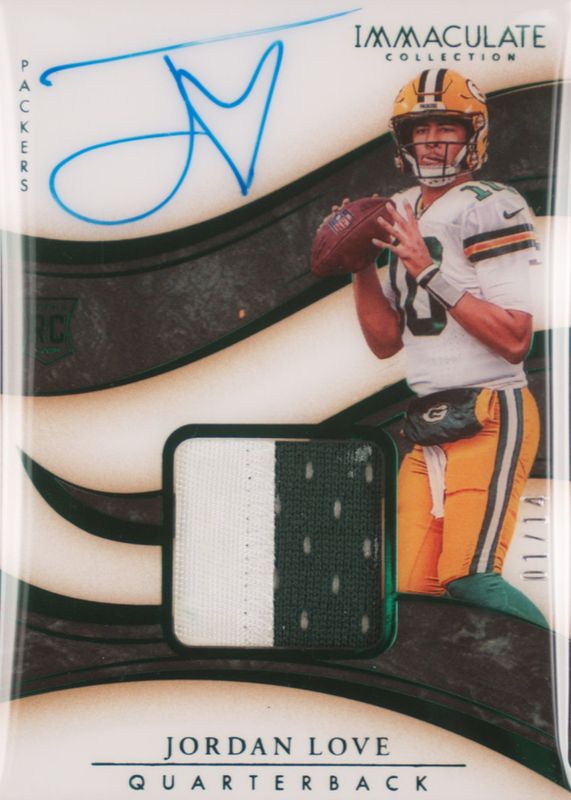This card is 1 of 26 Jordan Love's card variations in the 2020 Immaculate set being tracked by Sports Card Investor, including Immaculate Introductions Autographs (/25), Immaculate Numbers Rookie Patch Autographs (/10), Immaculate Rookie Eye Black Jersey Autographs (/99), Immaculate Rookie Shadowbox Signatures (/49), and Immaculate Rookie Signature Patches (/75).