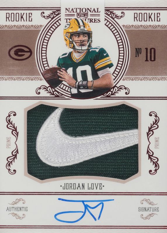This card is 1 of 49 Jordan Love's card variations in the 2020 National Treasures set being tracked by Sports Card Investor, including Rookie Patch Auto /99, Rookie Patch Auto - Green Jersey Number (/10), Rookie Patch Auto - Holo Silver /25, Rookie Patch Auto - Midnight /20, and Rookie Patch Auto - Stars & Stripes /20.