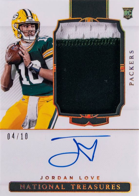 This card is 1 of 49 Jordan Love's card variations in the 2020 National Treasures set being tracked by Sports Card Investor, including Rookie Patch Auto /99, Rookie Patch Auto - Green Jersey Number (/10), Rookie Patch Auto - Holo Silver /25, Rookie Patch Auto - Midnight /20, and Rookie Patch Auto - Stars & Stripes /20.