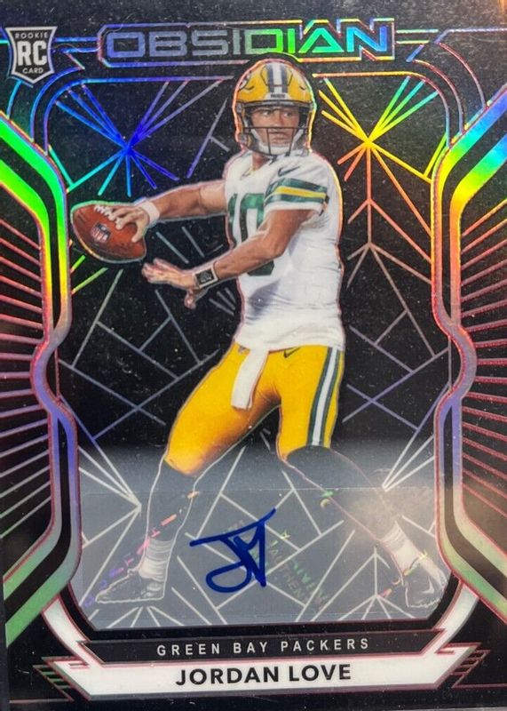 This card is 1 of 21 Jordan Love's card variations in the 2020 Obsidian set being tracked by Sports Card Investor, including Rookie Autographs (/150), Rookie Autographs - Electric Etch Green (/50), Rookie Autographs - Electric Etch Orange (/75), Rookie Autographs - Electric Etch Yellow (/25), and Rookie Jersey Autographs (/150).