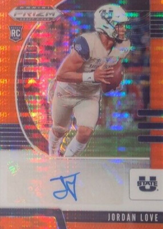 The Jordan Love 2020 Prizm Draft Picks #148 Autographs - Orange Pulsar /20 Rookie card in Raw condition has not changed in price in the last 30 days and was last sold for $153.61 .