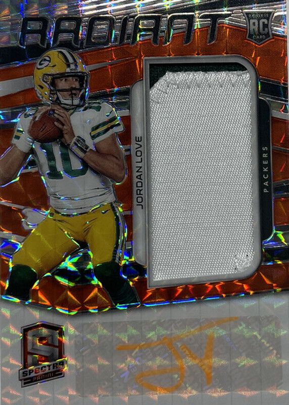 The Jordan Love 2020 Spectra #2 Radiant Rookie Patch Signatures - Neon Orange (/10) card in Raw condition has not changed in price in the last 30 days and was last sold for $300.00 .
