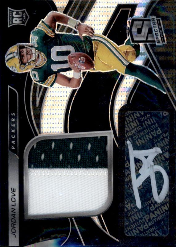 The Jordan Love 2020 Spectra #204 Rookie Patch Auto - Neon Black Light /10 card in Raw condition has not changed in price in the last 30 days and was last sold for $665.77 .