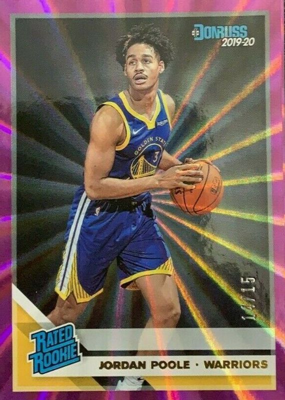 The Jordan Poole 2019 Donruss #226 Purple Laser /15 Rookie card in Raw condition has not changed in price in the last 30 days and was last sold for $50.00 .