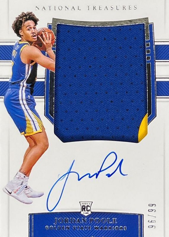 This card is 1 of 8 Jordan Poole's card variations in the 2019 National Treasures set being tracked by Sports Card Investor, including Rookie Patch Auto - Stars & Stripes /30, Rookie Patch Auto - Gold /10, Rookie Patch Auto - Emerald /5, Rookie Patch Auto - Stars & Stripes Blue /3, and Rookie Patch Auto - Logoman /1.