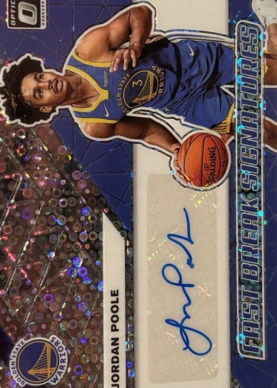 The Jordan Poole 2019 Optic #FB-JPL Fast Break Signatures Rookie card in Raw condition has not changed in price in the last 30 days and was last sold for $40.00 .