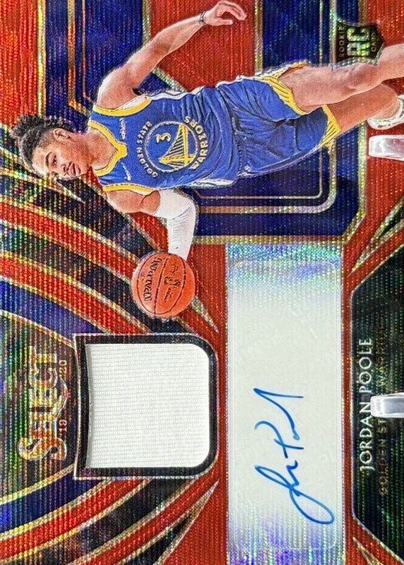 The Jordan Poole 2019 Select #RJA-JPL Rookie Jersey Autographs - Red Wave card in Raw condition has not changed in price in the last 30 days and was last sold for $50.00 .