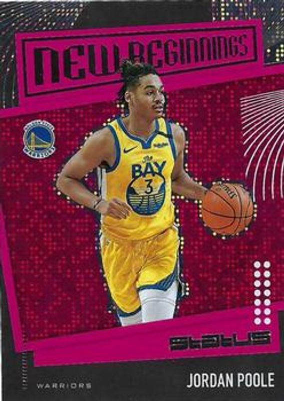 The Jordan Poole 2019 Status #18 New Beginnings - Red Rookie card is 1 of 14 Jordan Poole's card variations in the 2019 Status set being tracked by Sports Card Investor, including Base, Blue, Red, White Diamonds /125, and Green Escher Squares /49.