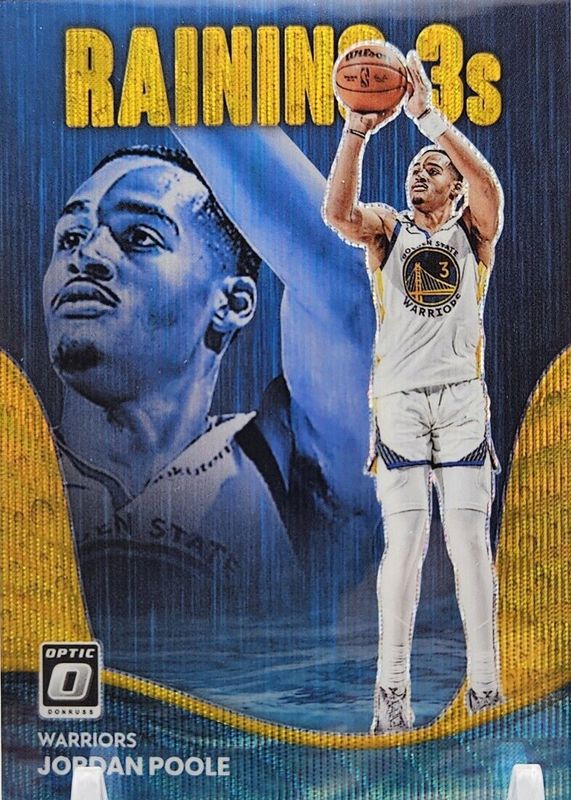 This card is 1 of 4 Jordan Poole's card variations in the 2022 Optic set being tracked by Sports Card Investor, including Raining 3s - Gold /10, Raining 3s - Green /5, and Raining 3s - Gold Vinyl /1.
