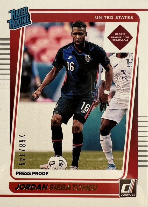 The Jordan Siebatcheu 2021 Donruss #194 Press Proof Gold /349 Rookie card in Raw condition has not changed in price in the last 30 days and was last sold for $0.99 .