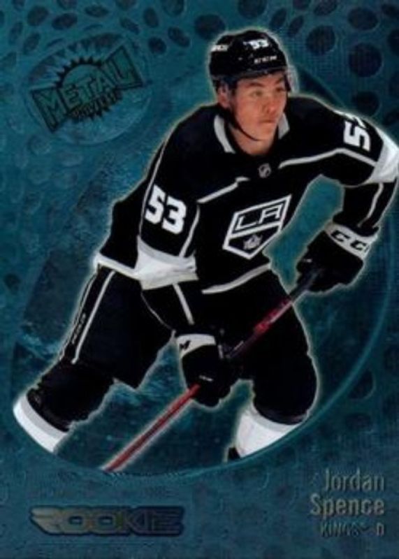 The Jordan Spence 2022 Metal Universe #179 Spectrum FX Blue Rookie card is 1 of 32 Jordan Spence's card variations in the 2022 Metal Universe set being tracked by Sports Card Investor, including Base, Spectrum FX Purple /199, Precious Metal Gems Green /100, Precious Metal Gems Red /100, and Precious Metal Gems Gold /1.