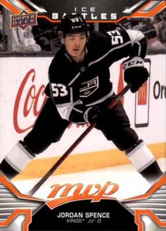 The Jordan Spence 2022 Upper Deck MVP #249 Ice Battles Rookie card is 1 of 17 Jordan Spence's card variations in the 2022 Upper Deck MVP set being tracked by Sports Card Investor, including Base, Blue Script, Gold Script, Silver Script, and Super Script /25.