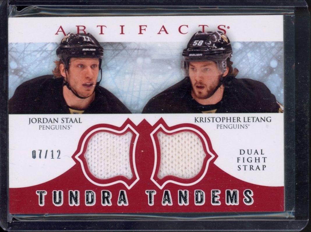The Jordan Staal 2012 Upper Deck Artifacts #TT-SL Tundra Tandems Fight Straps Red /12 card is 1 of 21 Jordan Staal's card variations in the 2012 Upper Deck Artifacts set being tracked by Sports Card Investor, including Base /699, Emerald /99, Sapphire /85, Gold Spectrum /25, and Black /5.