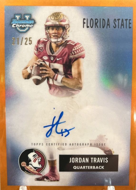 2023 Bowman Chrome U Jordan Travis 1955 Bowman Autograph Orange /25 On-Card