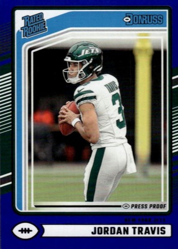 2024 Panini Donruss Jordan Travis Rated Rookie Press Proof Blue #349 Jets RC (F)