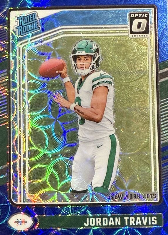 2024 Donruss Optic #260 Jordan Travis Blue Scope RC REFRACTOR ROOKIE Jets J12