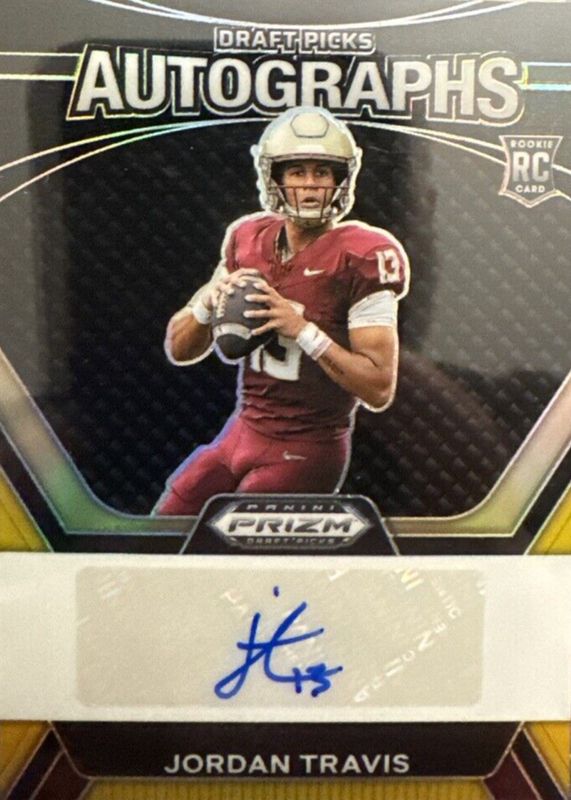 The Jordan Travis 2024 Prizm Draft Picks #DPA-JTS Draft Picks Autographs - Black & Gold /5 Rookie card in Raw condition has not changed in price in the last 30 days and was last sold for $34.77 .