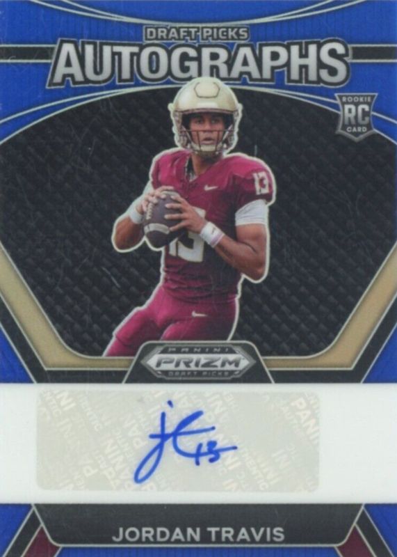 The Jordan Travis 2024 Prizm Draft Picks #DPA-JTS Draft Picks Autographs - Blue /149 Rookie card in Raw condition has not changed in price in the last 30 days and was last sold for $3.50 .
