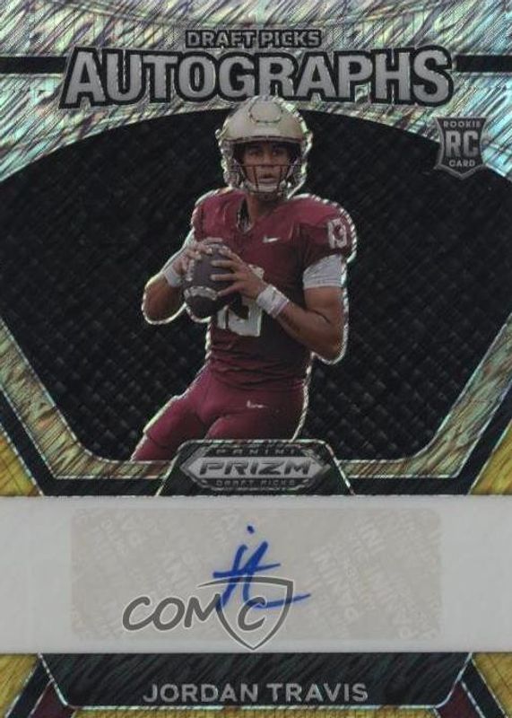 The Jordan Travis 2024 Prizm Draft Picks #DPA-JTS Draft Picks Autographs - Gold Shimmer /15 Rookie card in Raw condition has not changed in price in the last 30 days and was last sold for $47.00 .