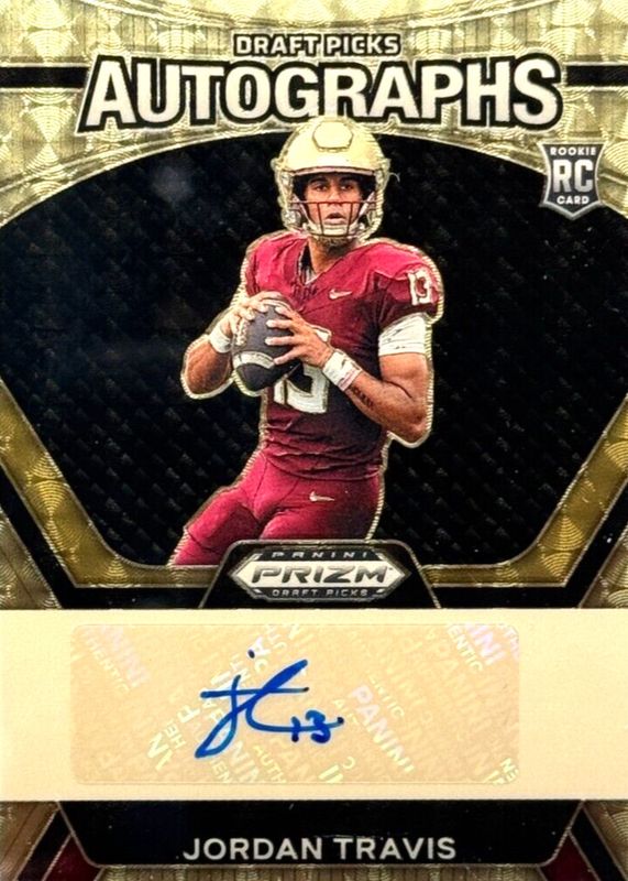 The Jordan Travis 2024 Prizm Draft Picks #DPA-JTS Draft Picks Autographs - Gold Vinyl /1 Rookie card in Raw condition has not changed in price in the last 30 days and was last sold for $365.00 .