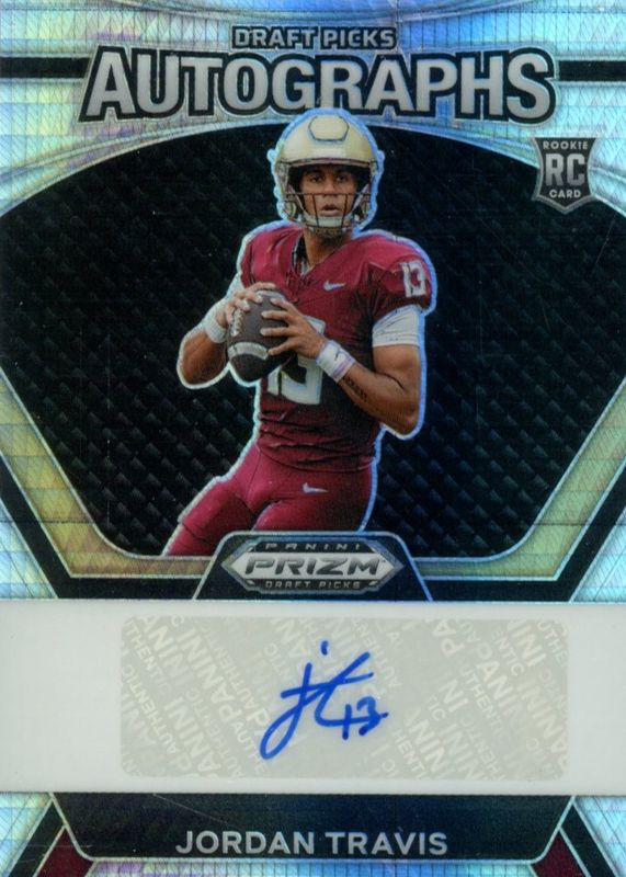 The Jordan Travis 2024 Prizm Draft Picks #DPA-JTS Draft Picks Autographs - Hyper Rookie card in Raw condition has not changed in price in the last 30 days and was last sold for $7.99 .