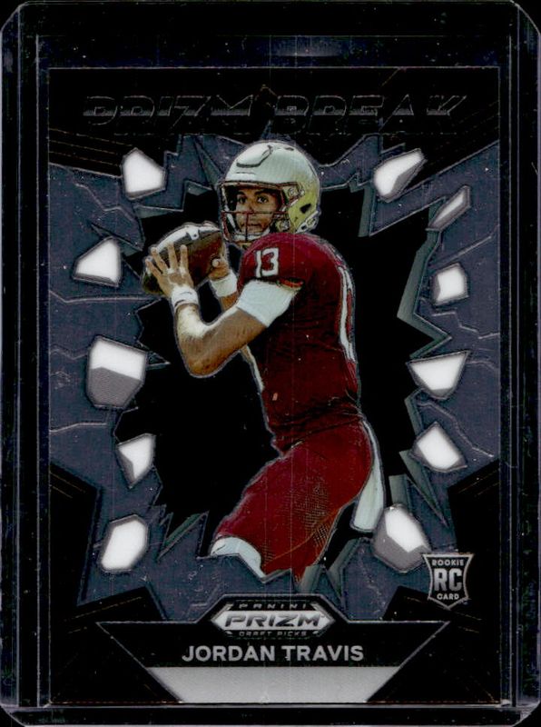 The Jordan Travis 2024 Prizm Draft Picks #PB-JTS Prizm Break Rookie card is 1 of 109 Jordan Travis' card variations in the 2024 Prizm Draft Picks set being tracked by Sports Card Investor, including Base, Green, Purple Wave, Red Ice, and Ruby Wave.