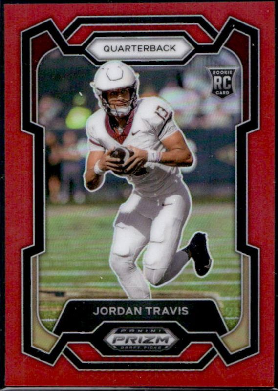 The Jordan Travis 2024 Prizm Draft Picks #138 Red /299 Rookie card is 1 of 109 Jordan Travis' card variations in the 2024 Prizm Draft Picks set being tracked by Sports Card Investor, including Base, Green, Purple Wave, Red Ice, and Ruby Wave.