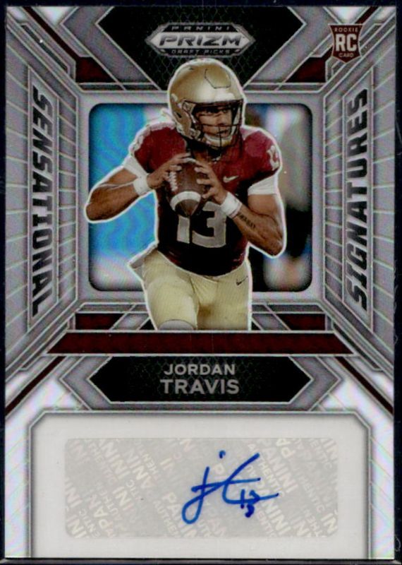 The Jordan Travis 2024 Prizm Draft Picks #SS-JTS Sensational Signatures - Silver Rookie card is 1 of 109 Jordan Travis' card variations in the 2024 Prizm Draft Picks set being tracked by Sports Card Investor, including Base, Green, Purple Wave, Red Ice, and Ruby Wave.