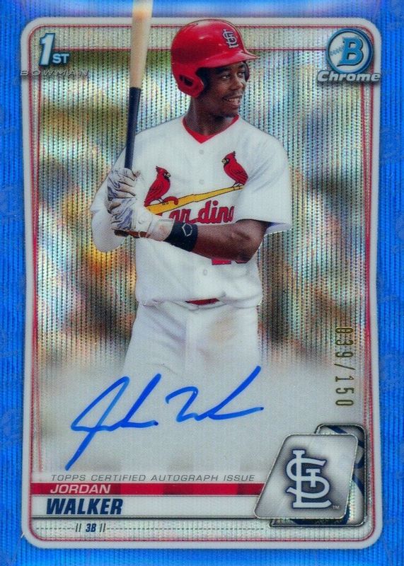 The Jordan Walker 2020 Bowman Draft #CDA-JW Chrome DP Auto - Blue Wave Refractor /150 (1st) card in Raw condition has not changed in price in the last 30 days and was last sold for $205.00 .