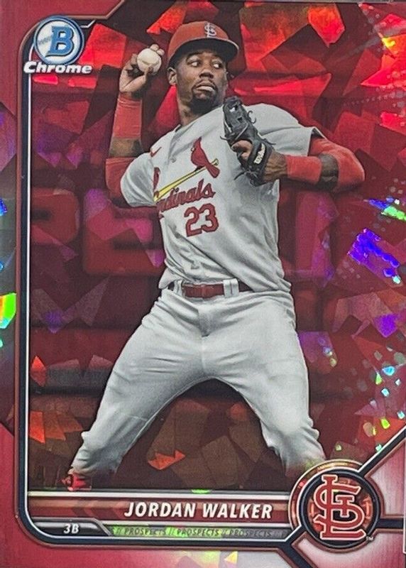 The Jordan Walker 2022 Bowman Draft Sapphire Edition #BDC-36 Chrome - Red /5 card in Raw condition has not changed in price in the last 30 days and was last sold for $121.50 .
