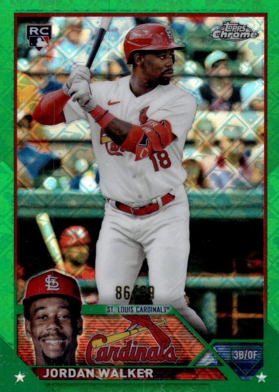 The Jordan Walker 2023 Topps Chrome Logofractor Edition #209 Green /99 Rookie card in Raw condition has not changed in price in the last 30 days and was last sold for $1.25 .