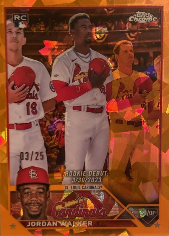 The Jordan Walker 2023 Topps Chrome Sapphire Edition #344 Orange /25 Rookie card in Raw condition has not changed in price in the last 30 days and was last sold for $43.26 .